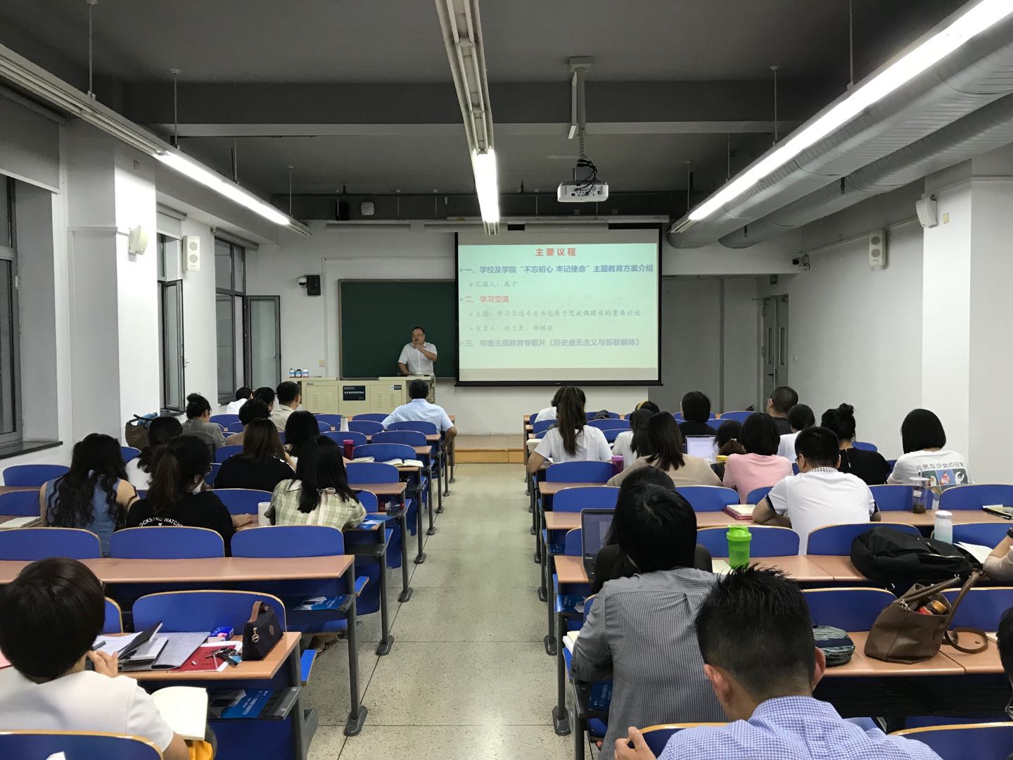 活动第一项议程由学院直属党支部书记高宁介绍了学校及学院“不忘初心、牢记使命”主题教育方案。高宁重点强调了主题教育将理论学习和调研紧密结合、在联系实际中检视问题、加强整改总结反思的各个环节和具体安排
