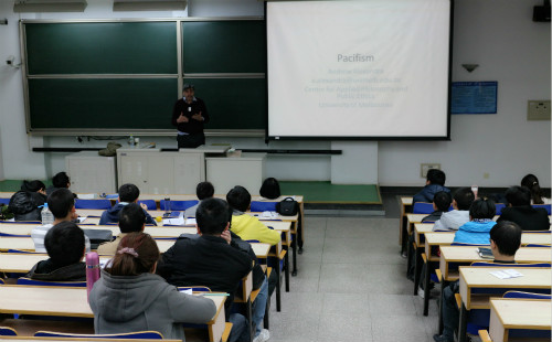 11月26日下午,Alexandra教授又面向全校师生作了另一场题为《国内维度中的和平主义》的报告。该报告从和平主义的核心主张切入,综合考察了自由主义视阈中的暴力观及其他为暴力辩护的观点,从现代军事作战模式、军队的形式与实质等角度比较了和平防御体系和军事防御体系,进而阐明和平防御体系在何种程度上能有效地维护国内社会价值与抵御外来威胁。