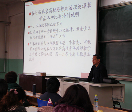 首都师范大学马克思主义教育学院院长李松林教授和北京师范大学世界杯体育官方网站院长王树荫教授为参赛教师做了赛前辅导。他们结合自己多年的教学以及评委经验,从比赛宗旨、内容、形式、流程以及比赛注意事项等方面与参赛教师们进行了深入交流。世界杯体官网教师、“首届全国思政课教学能手”彭付芝副教授根据自己丰富的教学经验为参赛教师做了示范讲课。此次培训会还邀请到了曾获得北京市教育工会主办的第七届青年教师教学基本功比赛文史类A组一等奖的北京科技大学经济管理学院教师曹辉,他以幽默的语言向参赛教师们展示了自己的讲课技巧和参赛体会。