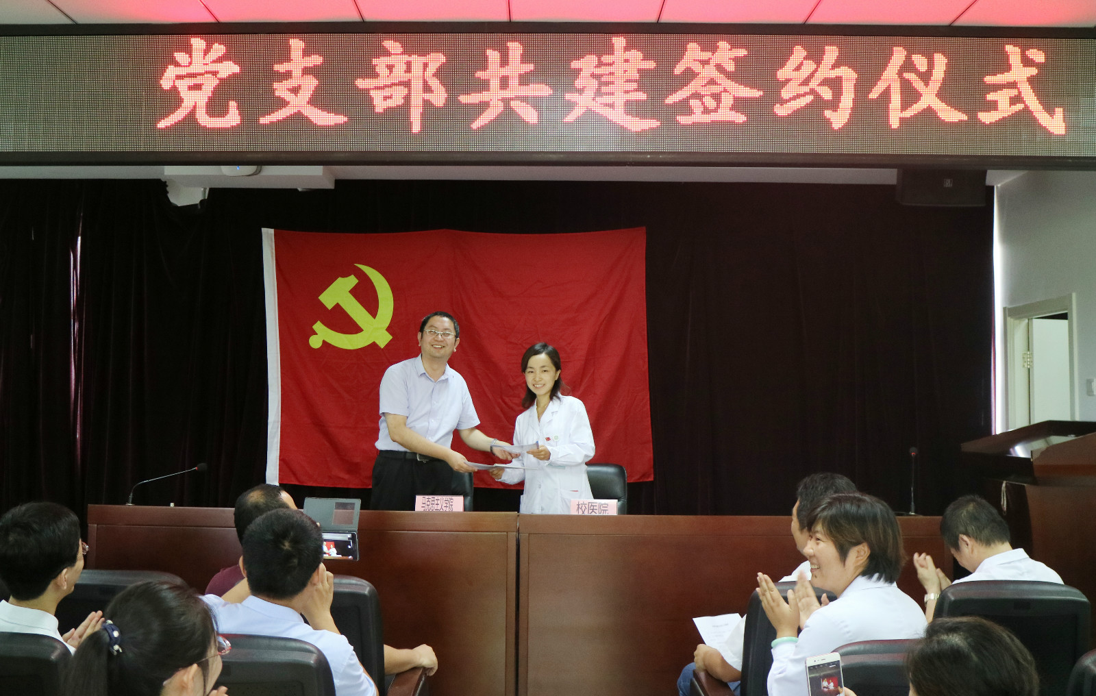 仪式上,校医院党总支书记徐亚军致辞指出,同为光荣而神圣的职业,教师以德育双馨为目标,医生以德医双馨为目标,两个党支部的共建具有特殊意义。世界杯体官网教工党支部书记高宁致辞指出,两个党支部共建,能够有效地实现资源共享和优势互补;马院教工党支部既要学习医生党支部的党纪党规意识和救死扶伤、勤于奉献的精神,也要发挥专业所长,为校医院的党建工作提供理论支持和经验参考。