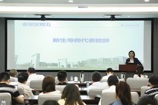 副院长王娜及硕士生导师王海宇代表新生导师致辞。王娜副院长在致辞中与各位导师分享了研究生培养的经验与方法,并对新生提出了要知晓大事、明确目标和正视竞争等要求,建议新生主动参与到自身学业规划的制定之中,以追求全面发展提高核心竞争力。王海宇老师以“高高山顶立,深深海底行”鼓励新生要求真务实确立远大志向、脚踏实地实现学术理想。