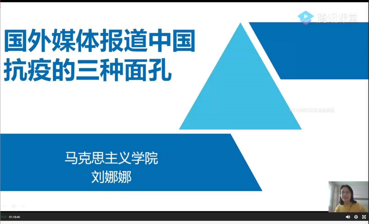 活动最后,全体教职工集体在线观摩了学院教师刘娜娜的《国外媒体报道中国抗疫的三种面孔——“大国战疫”系列专题思政课首场报告》。报告中,她梳理了战“疫”期间西方多家主流媒体的有关报道,分析了外媒报道中国抗疫的三种态度,以客观的事实和入理的分析引导学生们在信息化时代保持独立思考,学习习近平总书记关于疫情防控的讲话精神,坚定人民立场。
