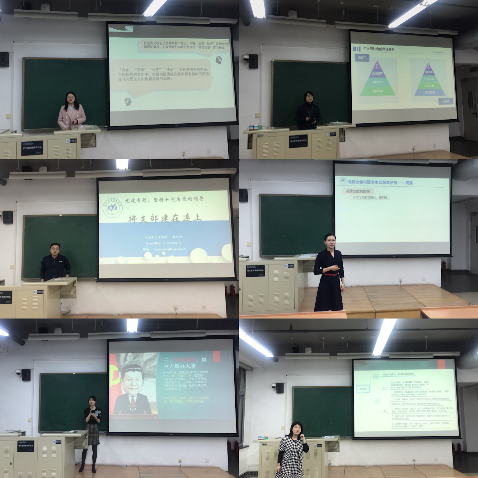 来自基础、概论、纲要和原理等教研部的6位教师通过现场抽签决定出场顺序,在现场教学环节选取了丰富多样的教学主题,通过多媒体展示、互动提问、案例讲授等多种教学方法进行了精彩的教学展示,博得了在场评委和观众的阵阵掌声。