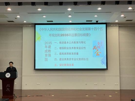 首先,分别由纲要教研部韩云霄老师领学《习近平总书记在党史学习教育动员大会上的重要讲话精神》和基础教研部王江伟老师领学《深化新时代教育评价改革总体方案》。韩云霄老师分别从为什么开展党史学习教育、开展党史学习教育有哪些要求、怎么样开展党史学习教育三个方面向大家分享了她的学习体会。王江伟老师分别从《总体方案》的背景与脉络、精神与内容、特点与要求等三个方面做了全面深刻的阐述。